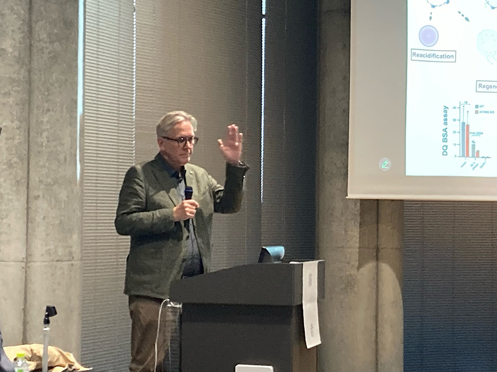今回は、ドイツ・Duisburg-Essen大学のHemmo Meyer教授を講師にお迎えし、リソソーム損傷応答の分子機構と恒常性維持に関する最新の研究成果についてご講演いただきました。Meyer教授の発表では、損傷を受けたリソソームがどのように感知・修復・除去されるのかといったプロセスを、具体的な分子メカニズムと最新データに基づいて丁寧にご紹介いただき、参加者との間で活発な質疑応答が交わされました。